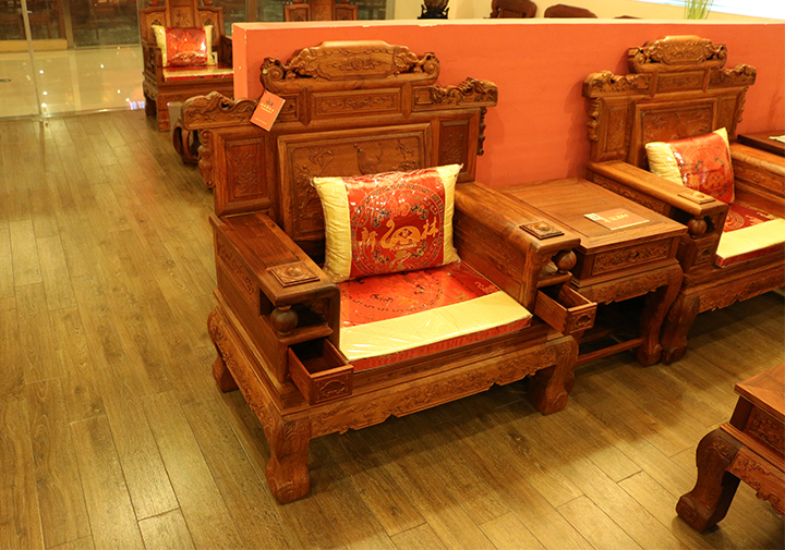 該款沙發(fā)所用材質(zhì)亦是福林堂紅木使用最多的大果紫檀,也叫緬甸花梨,屬花梨木類(lèi)。緬甸花梨的木紋清晰,結(jié)構(gòu)細(xì)而勻,有些部位有明顯的虎皮紋,斷斷續(xù)續(xù)很是美觀;顏色偏紅色,其木紋為淡紅色,整體看上去有點(diǎn)肉色;緬甸花梨自身帶有一種特別的檀香味,其香悠遠(yuǎn)醇厚,不張揚(yáng);其材質(zhì)硬重,密度高。