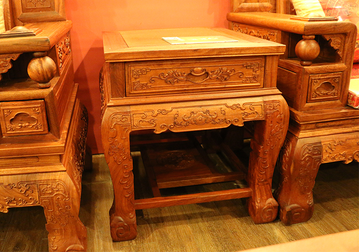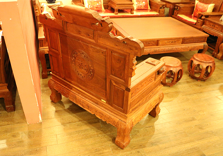 之后,我們?cè)賮?lái)看看沙發(fā)的細(xì)節(jié):雕刻紋樣。單人沙發(fā)背板后刻有一大圓形“?!弊謽拥膱D案,有福祿雙全、福星高照之意;在沙發(fā)正上方刻有一帶“發(fā)”字的花紋,寓有大吉大利、財(cái)源亨特之意;沙發(fā)正背板處刻有樹(shù)杈、枝葉以及小鳥(niǎo),頗顯生氣與活力,帶有春意濃濃、朝氣蓬勃之寓意;沙發(fā)靠手兩側(cè)帶有一可以轉(zhuǎn)動(dòng)的滾珠,在其下方則有一可以推入拉出的小屜,多以裝飾之用。我們?cè)賮?lái)看看與之沙發(fā)配套的高幾,高幾上方抽屜拉環(huán)處刻有一十分立體飽滿(mǎn)之元寶圖案,彰顯著財(cái)運(yùn)滾滾系列沙發(fā)的初始寓意,其下方鑲嵌刻有一古時(shí)候人們常佩戴之金鎖圖案花紋,并串有幾圈環(huán)形銅錢(qián),而兩側(cè)則分別帶有兩只金雞圖案的刻紋遙頭相對(duì),昭示著金雞破曉,財(cái)源廣進(jìn)之意,十分形象生動(dòng)。在其幾腿上則配以祥云花紋環(huán)繞相倚,給人一渾渾一體、流暢行云之感。其他兩只,雙人長(zhǎng)沙發(fā)以及臺(tái)幾其中花紋也多以其類(lèi)似相間,鑒于筆者文字水平以及無(wú)實(shí)物接觸的原因,有些細(xì)節(jié)之處可能并未在此提及,不過(guò)這一系列之沙發(fā)總體以賦含了“財(cái)源滾滾”“財(cái)運(yùn)亨特”“大吉大利”之意,配之以古樸的木雕工藝以及中國(guó)文化之豐富內(nèi)涵與底蘊(yùn),給人以一股極為濃郁的東方家具之氣息,美麗沉淀。