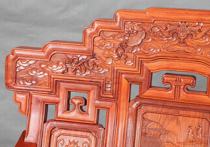 最后,來說說背靠板最上端部分的那綿延浮縷、緊密嚴挨著的充斥于其間的祥云云海紋飾。該處圖案可以說是整體沙發(fā)圖案中最為驚艷也是最為惹眼的一處了,在這其中也還另在正中位置處雕繪有寄寓幸福之意的蝙蝠紋;以及下方銜掛有的“磬”紋(磬——它是中國古代宮廷的打擊樂器,形有大有小,上方刻有花紋,并鉆孔懸掛于架下,用以擊打傳聲,其聲響通透清亮極為悅耳);左右兩側(cè)板面另還雕飾有幾處寄寓福壽平安之意的道八寶紋飾,從左往右分別是魚骨、羽扇、寶葫以及玉板四處。整處圖案雕飾于呈階梯式層層遞進延伸之外輪廓,銜駕于最上端背板之上,在呈現(xiàn)美好寄寓的同時也同樣有著寶座威嚴、尊貴之氣勢,也更適合擺放在平常家中使用。