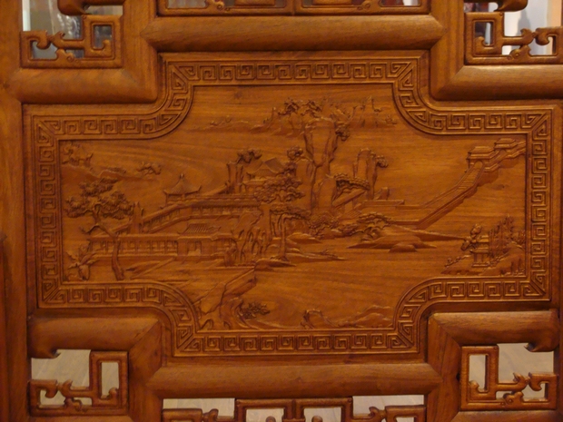 最后,再重點(diǎn)說(shuō)說(shuō)扶手內(nèi)外兩側(cè)處的紋飾圖案部分,同樣如上方“松柏庭宇云海圖”給人的第一感覺(jué)一樣,該處畫(huà)案整體之風(fēng)格偏重山水文人畫(huà)一類,依舊是挺拔筆直的松樹(shù),閑庭屹立的庭宇,還有那可以倚照著波光漣漪的湖水,感受到的那悉簌搖擺的徐徐的微風(fēng),飄蕩在這靜怡的湖面之上。一座有著扶手的欄倚小橋駕于在湖面上,連接著湖岸兩端,幾處矮實(shí)的小戶瓦樓簇居而座,整體畫(huà)面給人一種“小橋流水人家”的彎延意境美,綿延厚絕。