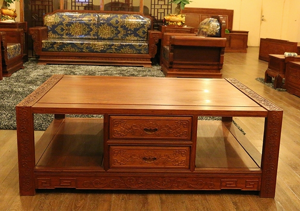 其他幾個部件:二人座長沙發(fā)處之紋飾設(shè)計(jì)以及大體形態(tài)與單人座沙發(fā)大致保持了一致;而在高幾部分,除牡丹花紋飾外另還能看見的還有元寶圖案雕飾,雕繪于上方抽屜層面左右前方位置處,意帶有“滾滾財源”“吉祥富貴”之寓意;同樣在大平幾位置的紋飾也同高幾一同,而平滑顯著淡雅光澤的桌面更覺舒適。