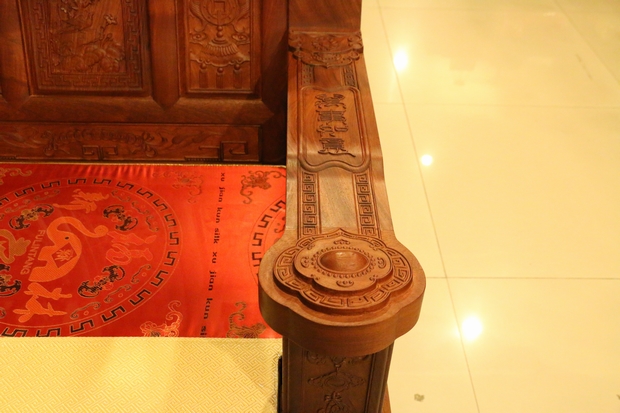 說(shuō)完了背板,我們?cè)賮?lái)看看沙發(fā)的兩處扶手,在扶手上方的正中位置,雕繪有四個(gè)很清晰的字眼:萬(wàn)事如意,字體仍是采用的古漢字字體,其筆畫(huà)彎延有致,筆鋒靈動(dòng)飄逸,頗具藝術(shù)美感氣息,令人陶醉。而在其扶手末端之位置處,則是一分三層雕刻設(shè)計(jì)的立體紋飾圖案,用手輕撫摸之,層次立體感及舒適感十分明顯。另在扶手的外部側(cè)面處則還形象地雕繪有一框花籃,花籃內(nèi)花團(tuán)齊簇,顯得十分美艷,富貴華麗。