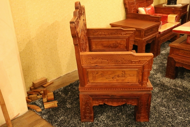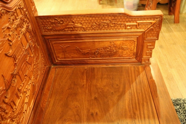 沙發(fā)的座椅面平整光滑,極盡原木材質(zhì)紋理之視覺感受;側(cè)面扶手處無任何鏤空面積之留飾,嚴(yán)實而框整,整體框架為矩形外觀設(shè)計。扶手上端正反兩面位置處,同樣雕繪有上處靠背板處鳳凰圖案形狀之紋飾,扶手底部正反兩面位置則雕繪有一些商周時期使用的器具,如斟酒器、編鐘等。