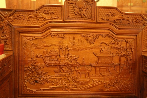 接下來,我們來看看沙發(fā)背靠板正面的主體部分,其畫案外部輪廓形狀呈現(xiàn)如一墨水瓶式形狀設(shè)計,上端較為扁實。內(nèi)部雕刻圖案展現(xiàn)得極為豐富艷麗,正如該款沙發(fā)名字所闡述的那樣——“漢宮春曉”,宛如一幅文人古畫卷中的景致,可以很清晰地看見:那波光漣漪的湖水載著亭臺綺立的龍舟,婉延而緩緩向前開來的景象,前段龍首處神情惟妙惟肖極為莊重而氣定神閑,畫案立于其主體的正中位置,顯得極為惹目和顯眼。在湖水岸邊,靠右端的湖岸上則是那茂密蔥郁的竹林,雖未能身處畫中,卻好似可以聽見,那一葉葉竹瓣隨著微風(fēng)飄蕩,窸窣碎碎交相搖晃時所發(fā)出的聲響,頗顯幽靜而深遠(yuǎn)。另在畫案后方的遠(yuǎn)景處,除了稀疏而立的幾目草木郊野,還有一座頂天而豎的寶塔,遠(yuǎn)遠(yuǎn)眺望著,好似氣派風(fēng)度。而在湖水的上方,還可以瞥見那兩只展翅高飛的仙鶴,它們乘風(fēng)而列,自由翱翔時的自在景象,也為整體的畫卷添加了某種只有身處仙境神域時所能感受體會的到的意境神韻感受,另外仙鶴它也代表了長壽與富貴,它仙風(fēng)道骨,為羽族之長,是為該幅富麗堂皇畫卷中的一處獨(dú)特景觀,妖嬈而鶴立。在整體圖案的其他位置,還雕繪有幾目莊嚴(yán)氣派矗于湖岸的亭臺樓倚,一尾身處龍舟后方悄悄而出的小帆舟,以及附著于畫卷中央下方位置處,飄縷浮動緩緩而延的祥云…