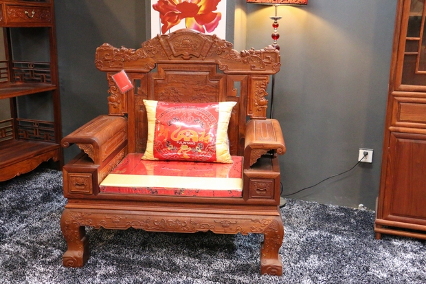 產(chǎn)品紋飾方面,該款沙發(fā)集中描繪了祥云、火珠、銅錢(qián)、元寶、蝙蝠、壽桃、松柏、金鎖以及一系列簡(jiǎn)單的幾何紋飾。單以單人位沙發(fā)為例,在結(jié)構(gòu)上,沙發(fā)整體類似有寶座風(fēng)格之外觀設(shè)計(jì),座腳之高度稍顯矮實(shí),并且寬厚粗壯而有力,稍許彎延。而在座面下方連接四處座腳的板面處另還雕繪有可以用做辟邪之用的寓意吉祥富貴長(zhǎng)壽之意的金鎖紋飾,以及在其左右兩側(cè)鑲嵌串饒著的寓有財(cái)源廣進(jìn)源源不斷之意的環(huán)環(huán)銅錢(qián)紋飾,而在這幅“金鎖銅錢(qián)”組合圖案的左右兩側(cè),還雕繪有兩只簡(jiǎn)約靈動(dòng)撫媚秀氣的草鳳紋,彰顯著富貴與幸福的美好寄寓。