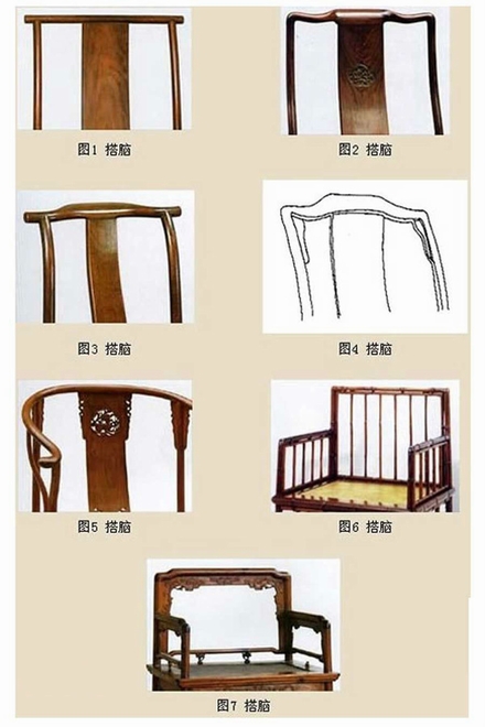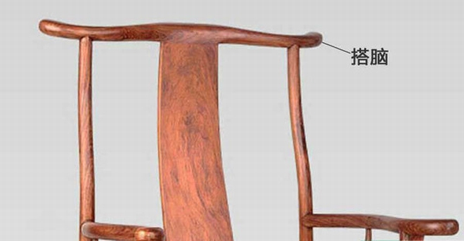 明清家具部件名稱。椅子、衣架等位于家具最上的橫梁叫“搭腦”。如明式椅子中最典型的搭腦有馬鞍式、挖油盞頭式、圓便直式、駱駝背式和天宮翅式等。造型千變?nèi)f化,但都具有流暢、挺秀的特點(diǎn)。