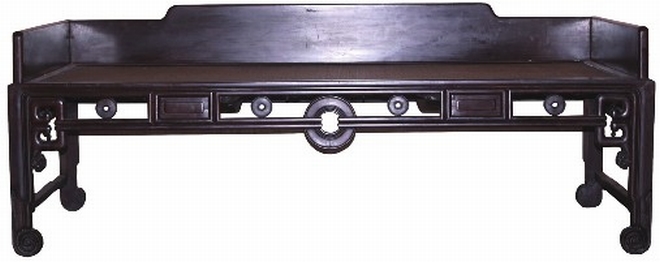 榻為紅木制,三塊光素的獨板做圍子,無束腰,攢框裝藤編軟屜為芯,直腿卷云紋。牙條正中為大銅錢紋飾,兩邊對稱嵌銅錢卡子花,榻兩側(cè)安羅鍋棖。