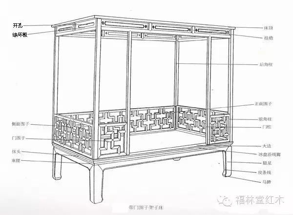 架子床是明清時期非常有代表性的一種臥具,其造型通常是四角有立柱,床面的兩側(cè)和后面裝有側(cè)欄,圍欄上面有各種裝飾元素,床頂有蓋,頂蓋四周裝有楣板和倒掛牙子,也有的架子床為了便于在床兩側(cè)安裝方形欄板——門圍子,就在床的正面多加兩根立柱,正中無圍處則是上床的門戶。還有一些架子床雕刻精致,在中間留出橢圓形的月洞門,非常美觀。